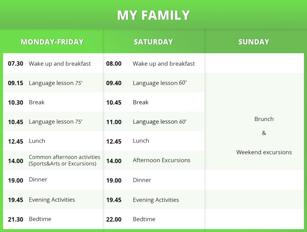 Children may be invited for the weekend by their parents or by a guardian approved by the parents. Weekend departures are only possible after Saturday morning classes – from Saturday 12:45 to  Sunday 6pm. Children may not leave or return to camp outside of these time frames.